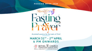 Passion Week 2026 – Fasting & Prayer Come and encounter the presence of God during this sacred Passion Week as we humble ourselves in fasting and prayer. Let us gather with one heart to seek the Lord, surrender our lives, and experience His overflowing grace in this Year of Abounding. Through anointed worship, powerful Word, and fervent prayer, believe for spiritual renewal, breakthroughs, healing, and a deeper walk with Christ. Join us as we wait on the Lord and allow…